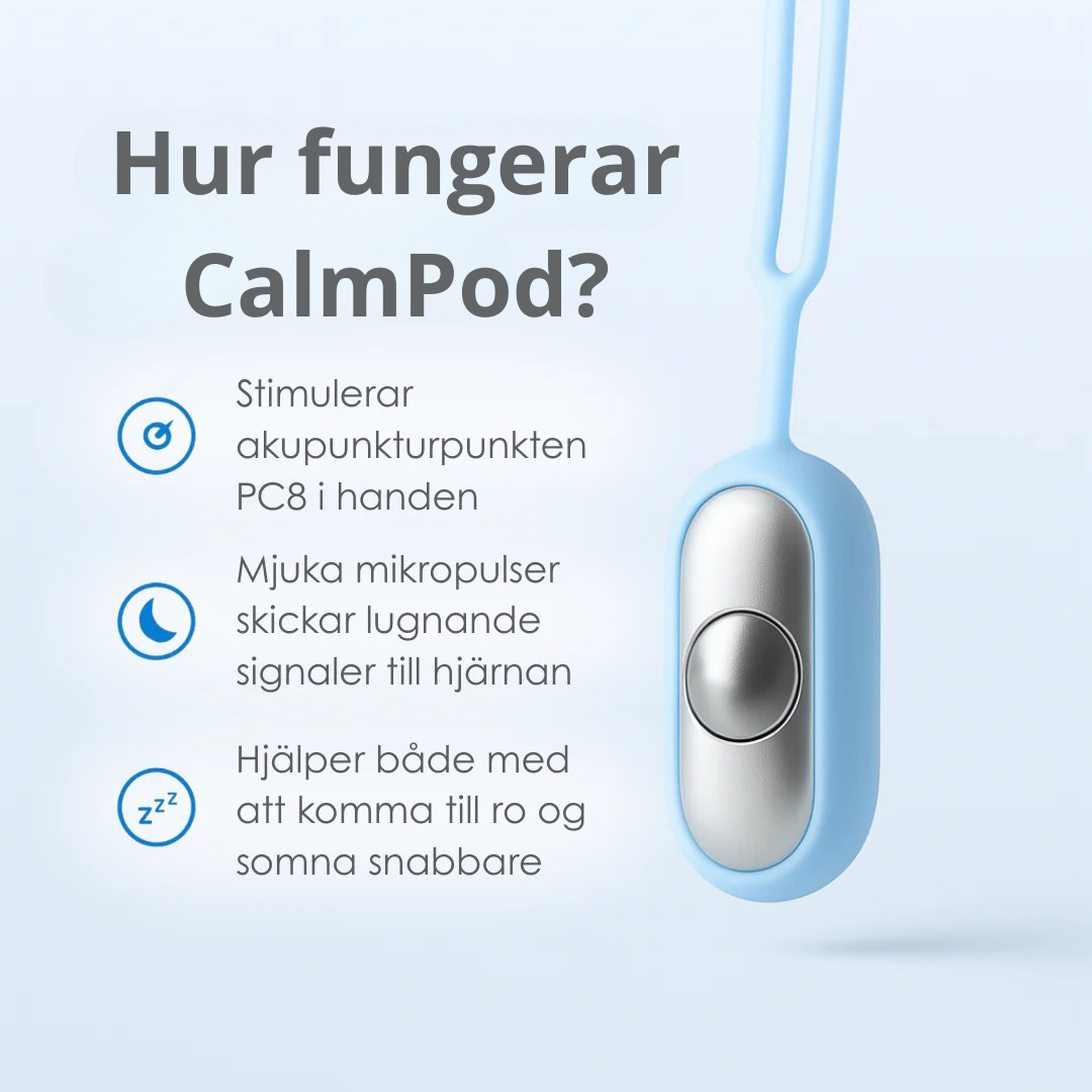 Genom att stimulera akupressurpunkten PC8 i handflatan hjälper CalmPod kroppen att varva ner på ett naturligt sätt, vilket leder till bättre sömnkvalitet, minskad oro och en djupare känsla av inre lugn.